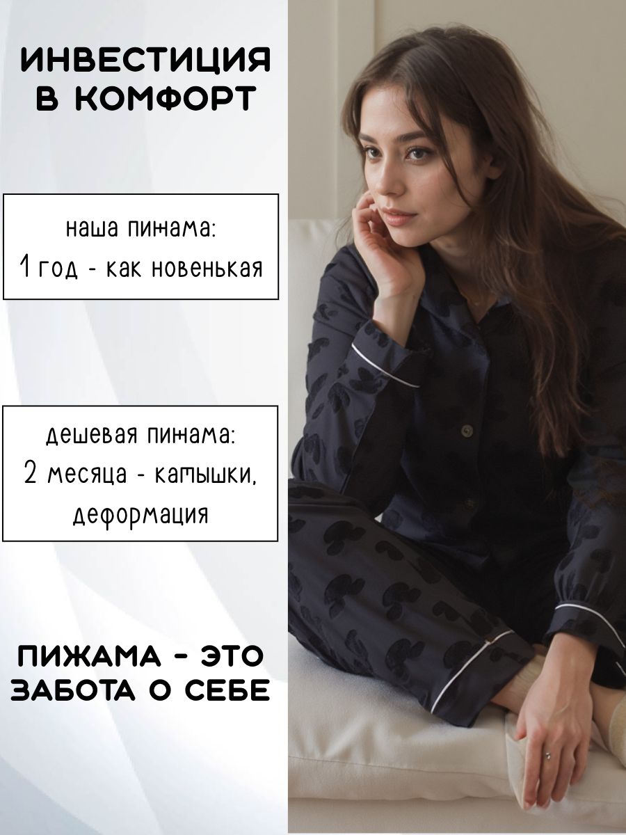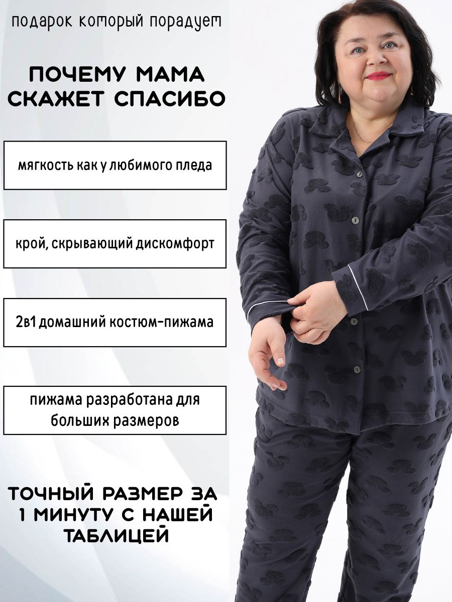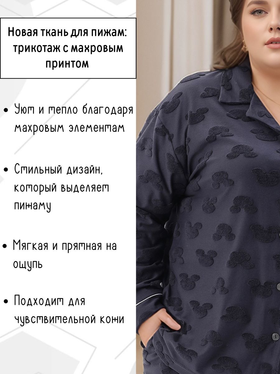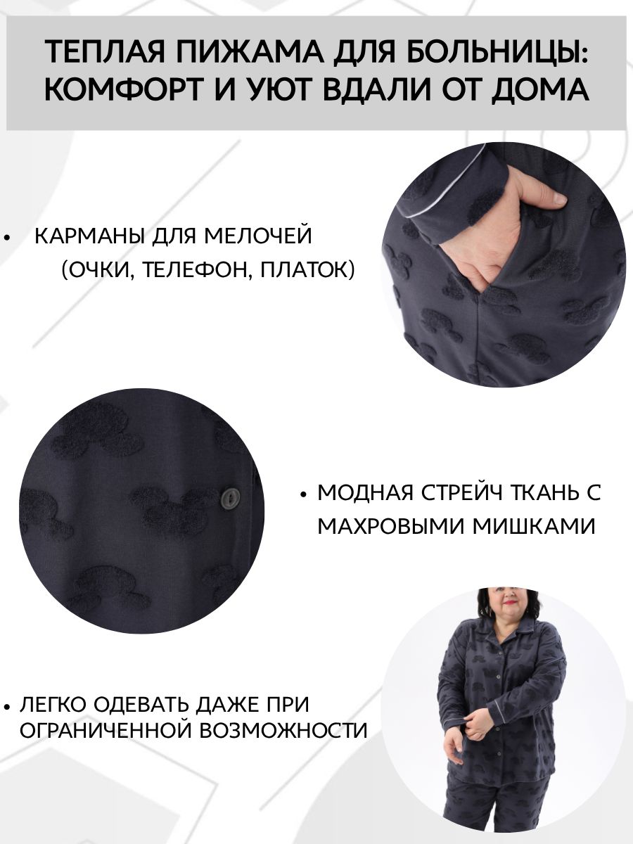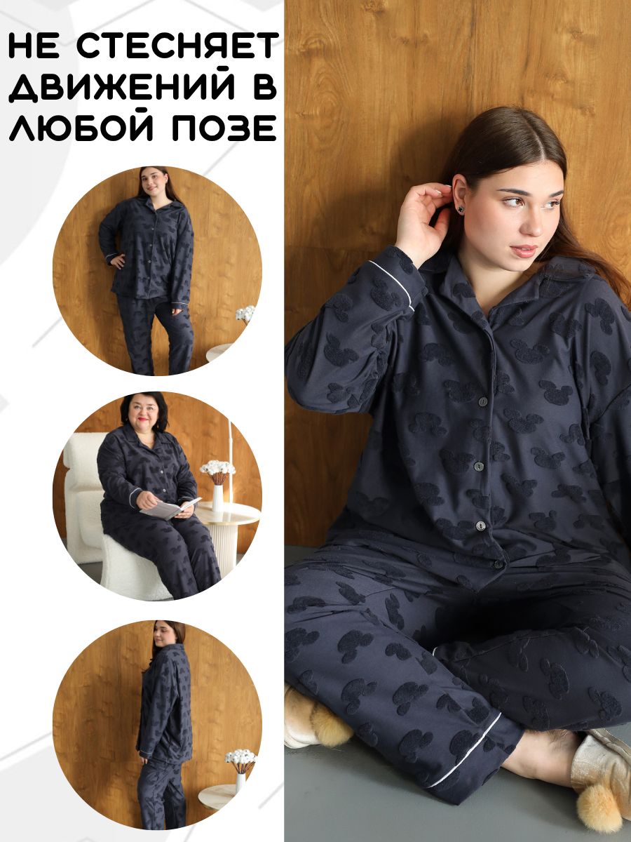 Девочки, знакомьтесь — пижама-объятие для холодных вечеров! Если вы искали теплую пижаму женскую больших размеров — вот она. Эта новинка создана специально для женщин с пышными формами, которые хотят и комфорта, и красоты. Никаких компромиссов. Ткань — стрейч-махра на трикотаже: мягкая, теплая, приятная к телу и с объемными махровыми мишками-вышивкой. Смотрится дорого и очень мило. Хочется трогать и не снимать. Преимущества: • Рубашка на пуговицах — удобно регулировать по настроению • Длинный рукав — не оголяется рука и сохраняется тепло • Высокая посадка брюк — комфортно животу, ничего не давит • Брюки не заужены — красиво садятся на ноги с любым объемом • Свободный, проверенный крой — без натяжек и складок Мы учли всё: • короткая спина — удлиненная посадка и по спинке, и по полочке • полные руки — широкий рукав и комфортная пройма • объемные бедра — обхват брюк от 148 до 168 см, резинка тянется еще на +30 см Размеры: 48-82 Это огромная редкость — и мы гордимся, что даем комфорт каждой. Все промеры указаны в карточке товара, чтобы вы выбрали размер идеально, без переживаний «влезет — не влезет». Пижама подходит для сна, домашнего уюта, гостей, поездок в санаторий или больницу. Отлично подходит и как подарок для любимых женщин. Эта пижама — ощущение, будто вас обнимают и дарят спокойствие. Партия лимитированная. Пока есть все размеры — забирайте свой.