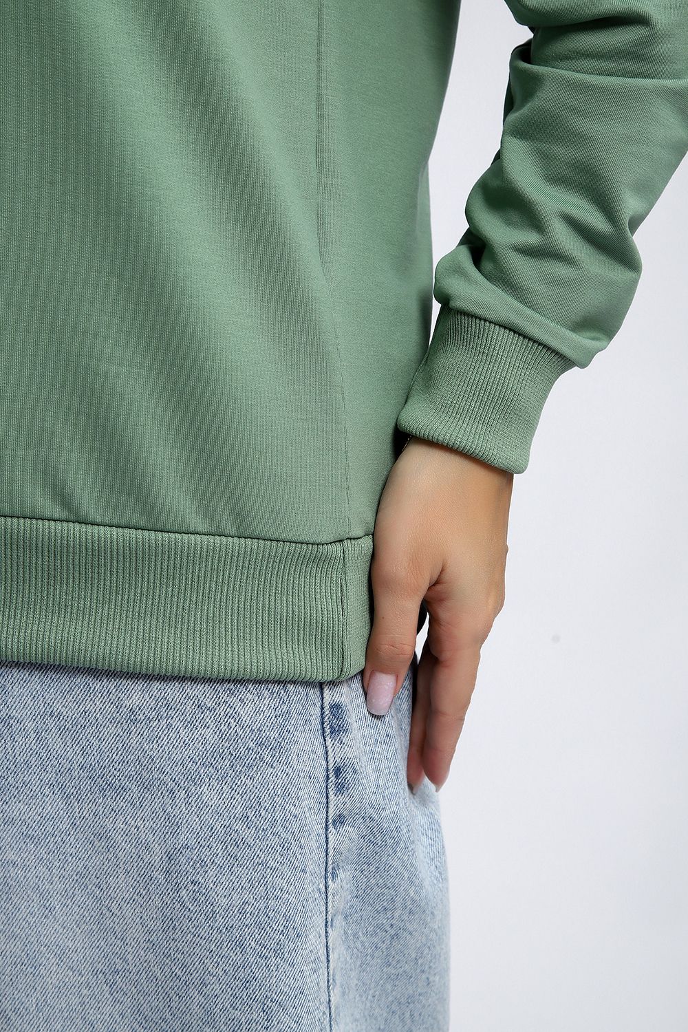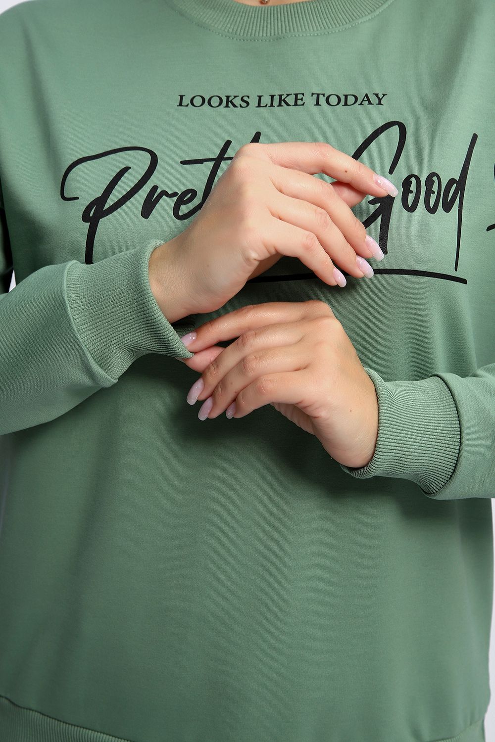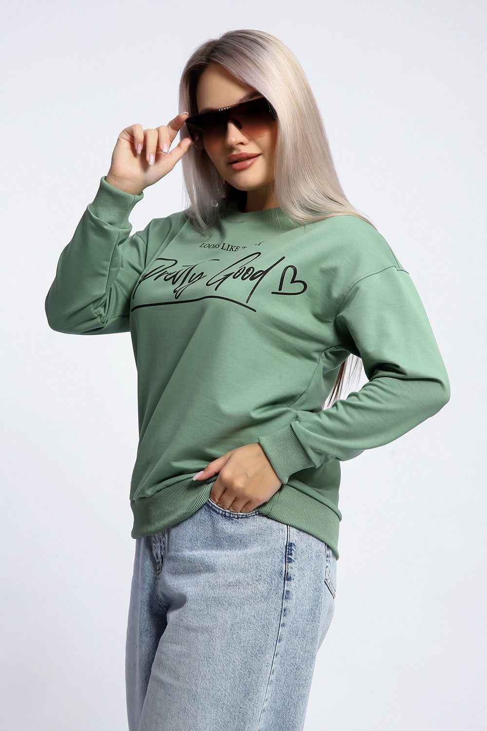 Толстовка свободного кроя "оверсайз" со спущенной линией плеча прекрасный вариант для прохладной погоды! Мягкое, эластичное кашкорсе в тон ткани использовано для отделки горловины, манжет и пояса. На полочке декоративный принт.