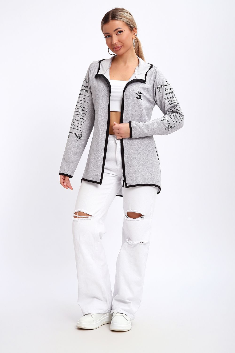 Туника необычного кроя на молнии, с капюшоном. Рукава длинные без манжетов, спинка длиннее переда. Карманы, рукава, капюшон и низ изделия обработан отделочной тканью. Принт на рукавах и полочке. Идеальное решение для прогулок, спорта или повседневного использования. Туника станет незаменимым элементом вашего гардероба.