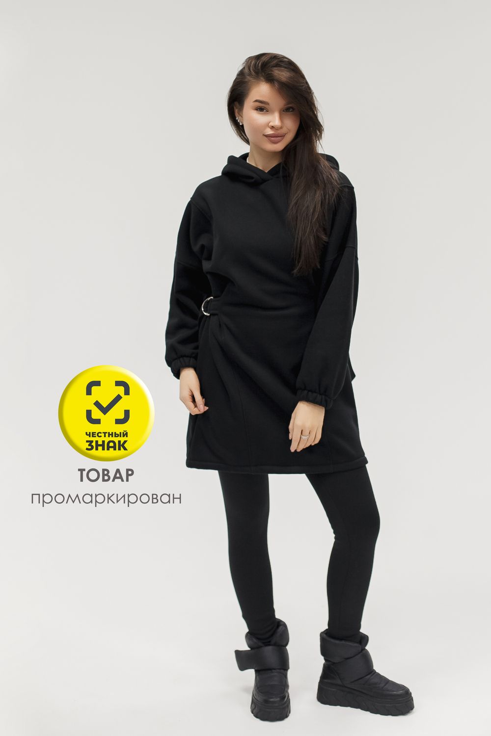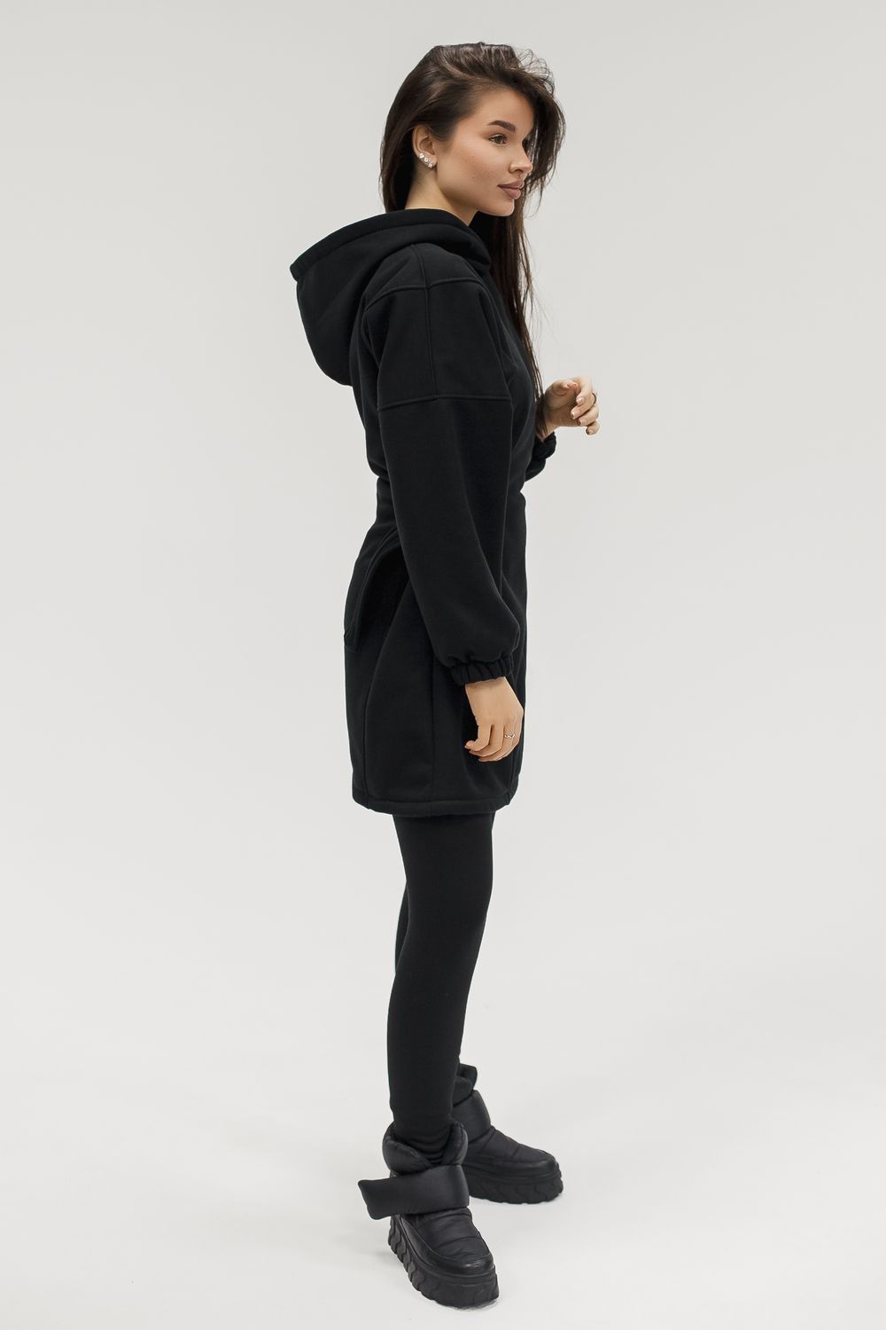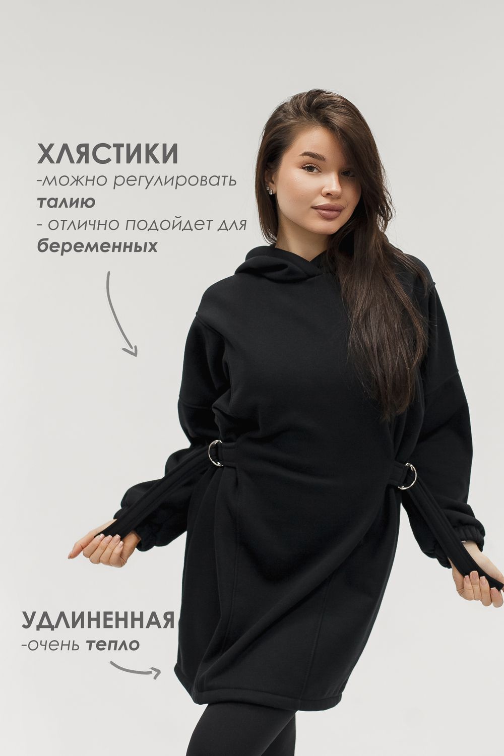 Туника женская теплая с капюшоном и хлястикамии - черный